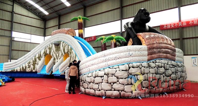 樂園中的三個黑色大猩猩造型被設計的異常逼真,讓游客忍不住會有前去和它合影留念的想法。滑梯的顏色則采用了和大山、巖石一樣的顏色,搭配及其合理,把花果山的造型形象的表述了出來,亦幻亦真,擁有如此優美意境的一款全新移動水上樂園,相信將會給周圍游玩的人群帶來一種怦然心動的感覺,讓他們會產生一種前去游玩一番的沖動!