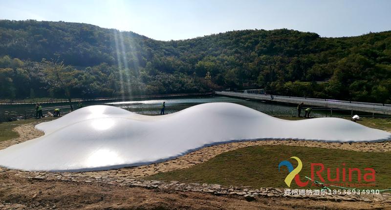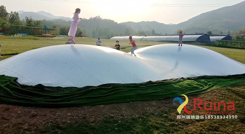 蹦蹦云樂園是新型無動力互動體驗式項目。形狀像朵朵白云,行云流水。尺寸根據場地環境設計而成吧,外觀形態不重復。不破壞土地,與大自然融為一體,藍天白云渾然天成。可跳、可坐、可滑、可躺、適合家庭親子休閑游樂,沒有年齡限制。設施無需電力持續驅動,材料選用日本平崗進口膜材耐磨、抗紫外線、自潔,保證外膜長期被游客坐臥、踩踏、彈跳后,再次清洗后依然清潔如新。